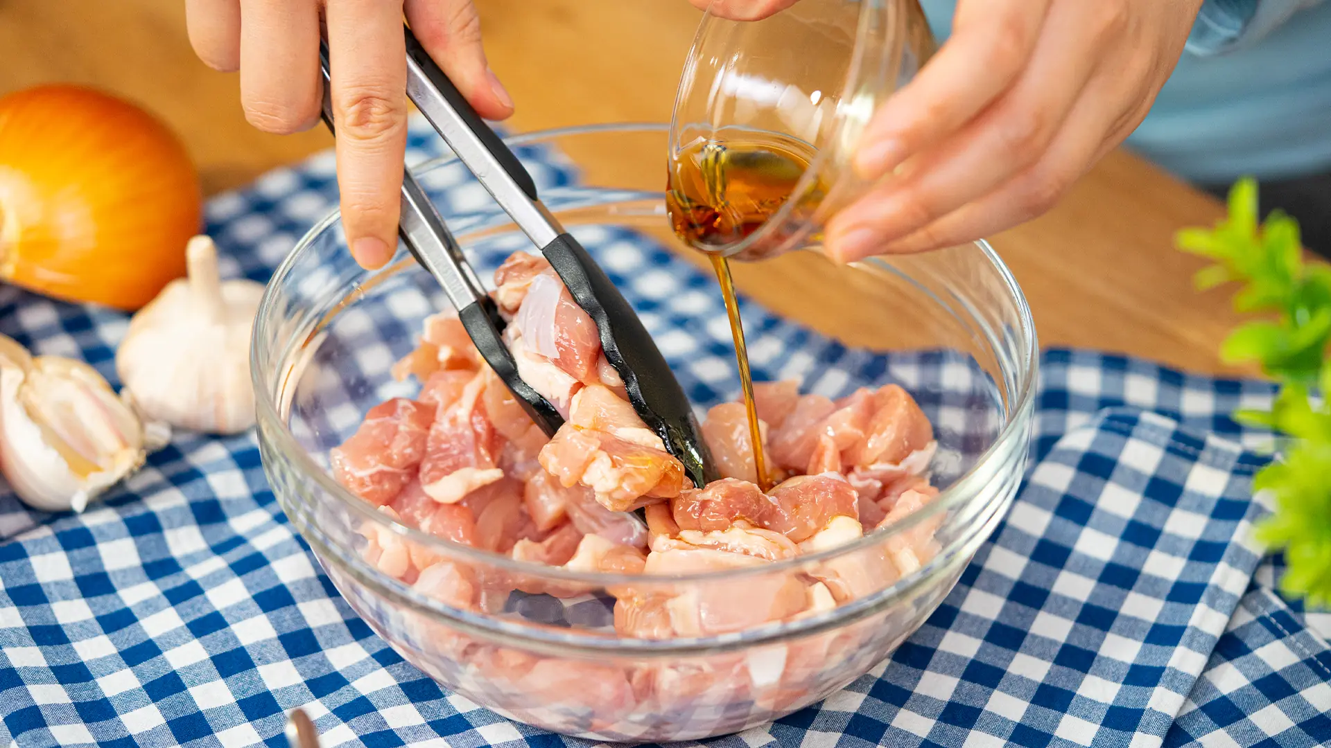 Cut Chicken Thigh (1 lb) into bite-size pieces (around 1-inch). Add to a bowl with the Sesame Oil (1 tsp). Toss until well coated and set aside.