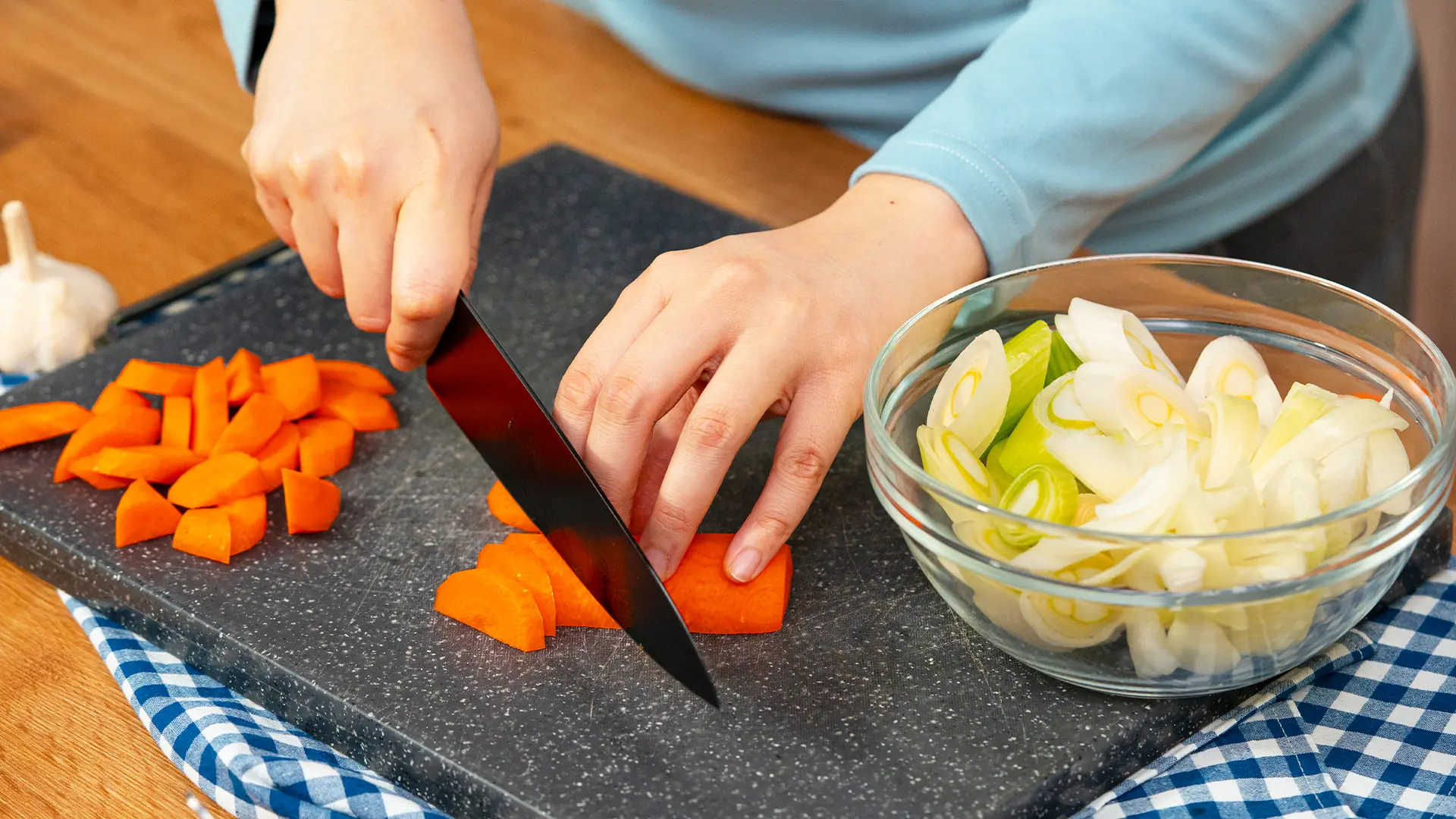 Cut the Carrot (1) in half lengthwise, then diagonally slice into 1/4-inch thick slices. Cut the white and light green part of the Leek (1) diagonally into about 1/2-inch slices. And slice the Yellow Onion (1/2) into 1/4-inch thick.