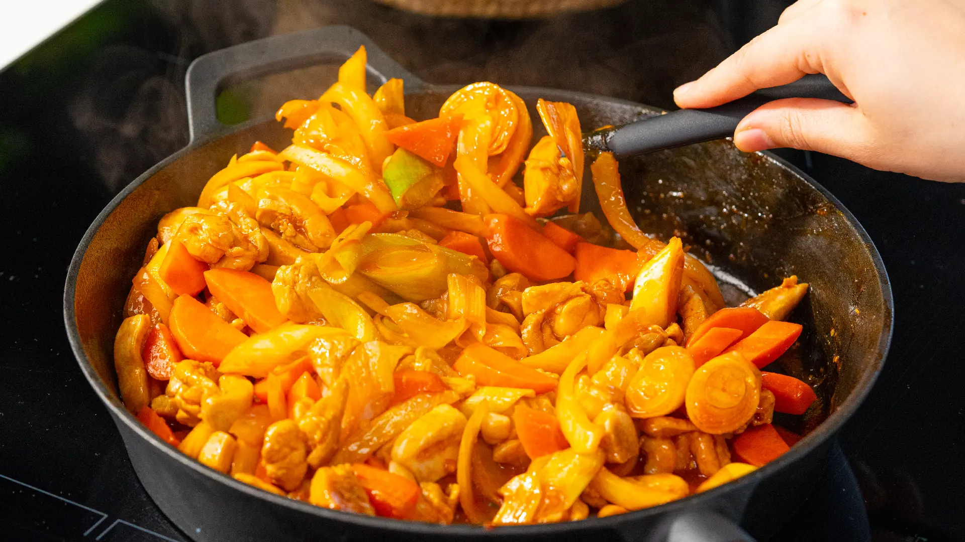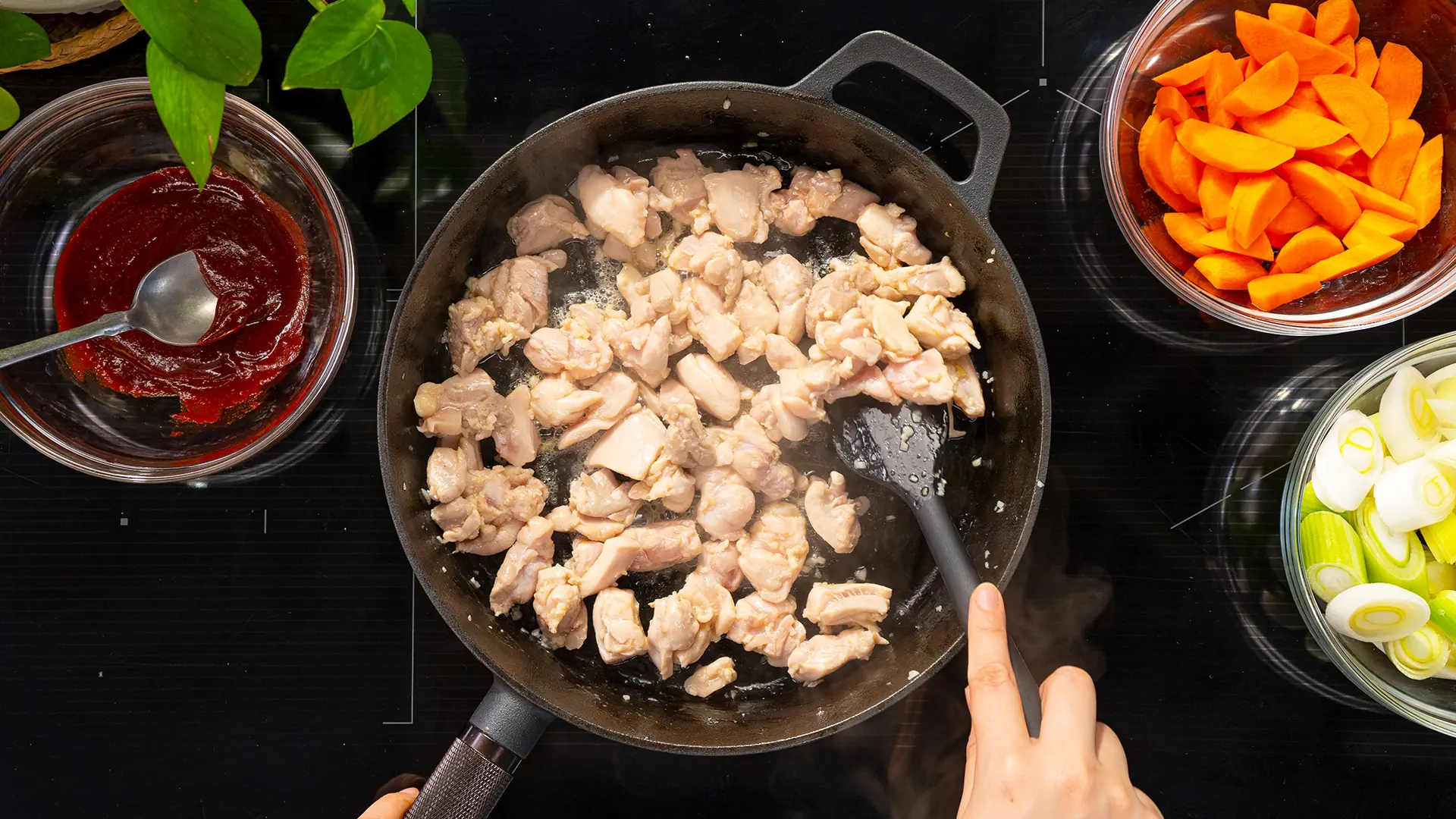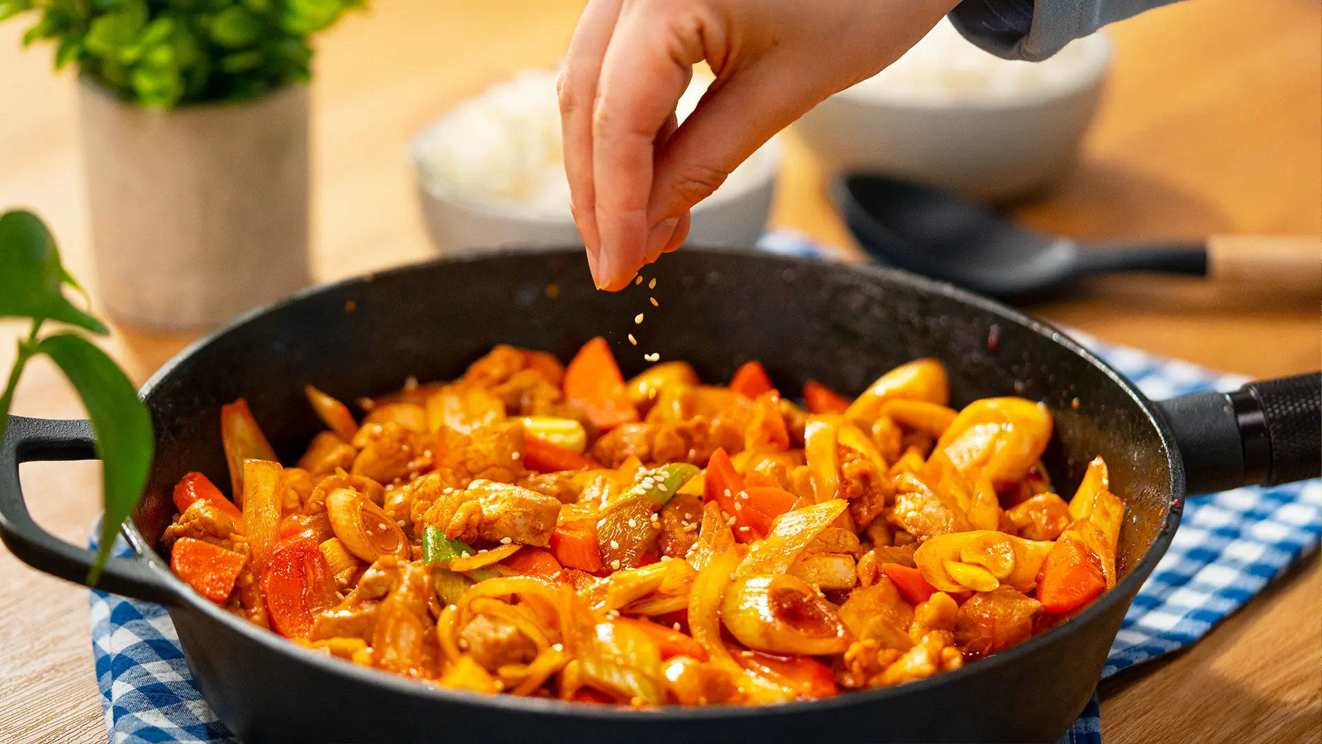 Gochujang is a sweet-spicy Korean chili paste. We think the sweet heat is perfect for a quick stir fry - and pairs great with the sweetness of carrots and onions. By using chicken thighs, this dish gets even more flavor, and using a cast iron lets us really turn up the heat and cook everything in a flash. Serve alone for a low carb or lighter option, or with some fluffy steamed rice for a full meal.