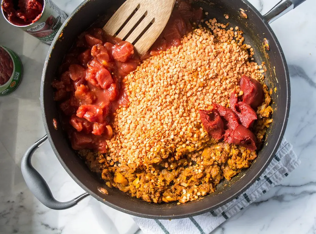 Add the Red Lentils (1 1/2 cups), Canned Diced Tomatoes (1 3/4 cups), Tomato Paste (1/3 cup), and Vegetable Broth (3 1/3 cups). Stir to combine and bring to a boil.