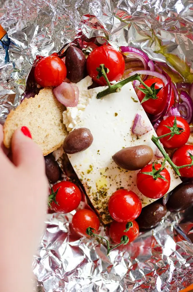 Set Feta Cheese (1 1/3 cups) in the center of a large sheet of aluminum foil. Drizzle with Olive Oil (2 Tbsp) and toss in the Olives (6), Cherry Tomatoes (10), Red Onions (4 Tbsp), Ground Black Pepper (to taste) and Fresh Oregano (to taste).