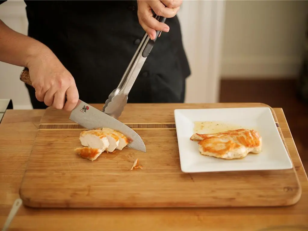 Slice the chicken ¼" thick at a 45-degree angle. This is called a “bias” cut. Transfer one sliced chicken breast to each plate and fan the chicken across bottom rim of plate. Drizzle chicken drippings from plate over sliced chicken.