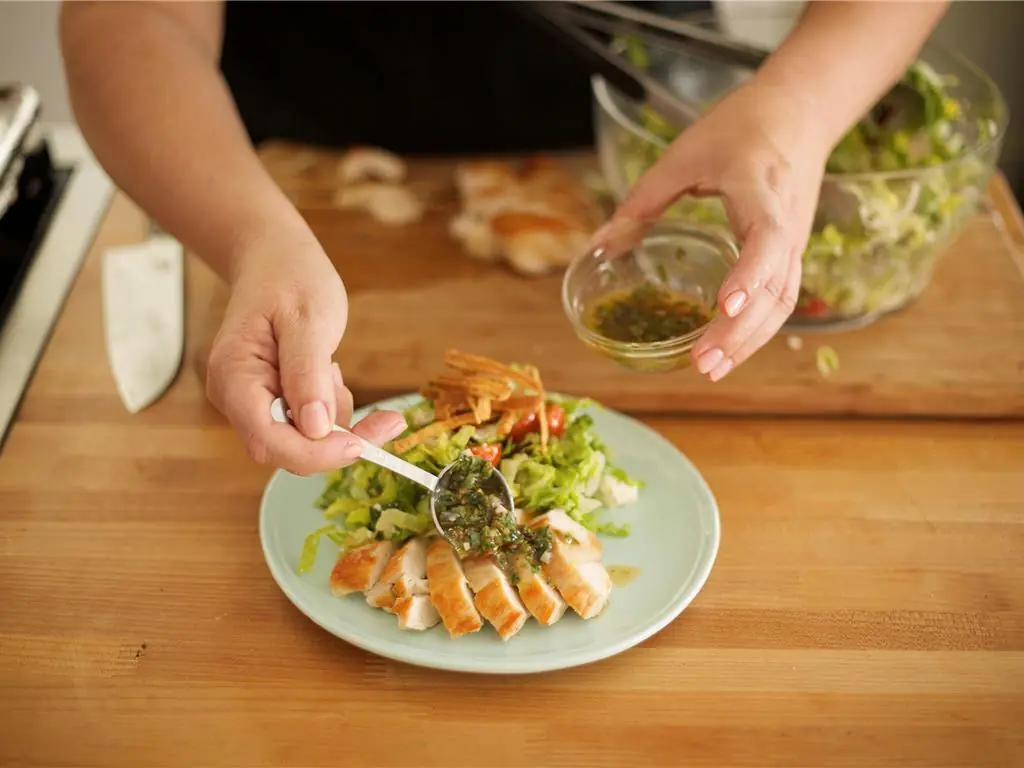 Gently toss the salad and divide evenly between two plates behind sliced chicken. Plate salad with height, being sure to showcase all ingredients. Top each salad with crispy pita crisps. Drizzle remaining dressing over sliced chicken on both plates