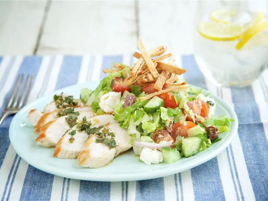 The flavors of Greece come together in this main-dish salad packed with lemon zest, oregano and mint for that life- on-the-Mediterranean feel. To perfectly cook the chicken breast, first sear it in a hot pan to develop a golden crust, then reduce the heat and cover to trap in all the moisture.