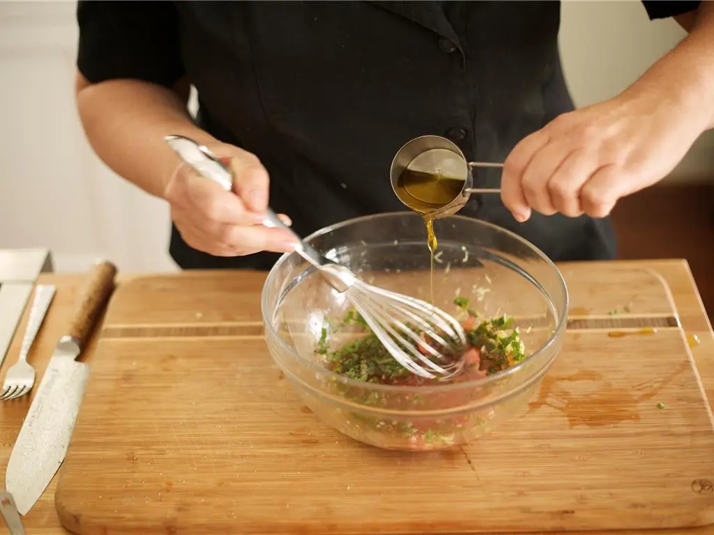 Zest and juice Lemon (1) into a large bowl. Add Dried Oregano (1 tsp) and stir. Finely chop Fresh Mint (1/3 cup) and Garlic (2 cloves) and add to the bowl. Add Red Wine Vinegar (1 tsp), Salt (1 tsp) and Ground Black Pepper (1/2 tsp). Slowly whisk in Olive Oil (4 Tbsp).