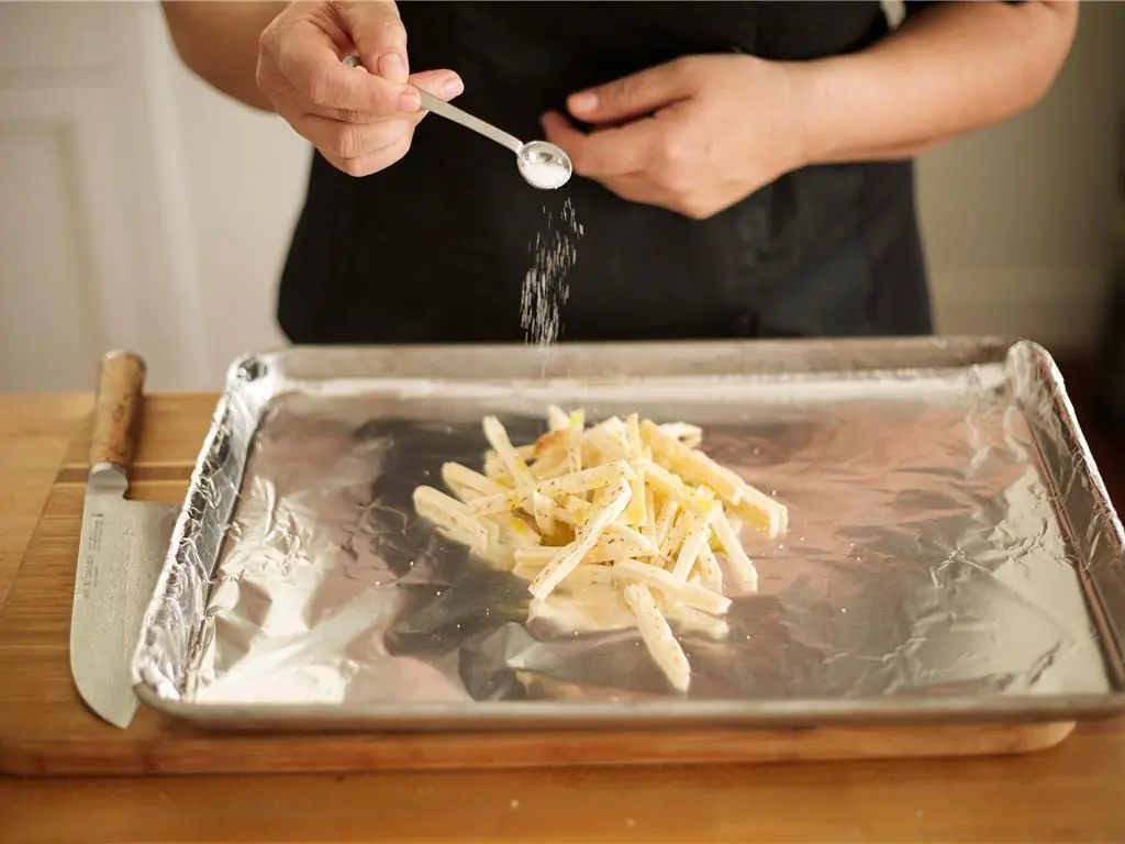 Cut Pita Bread (1) in half and slice across 1/4 inch thin to make strips. Place on baking sheet lined with foil. Sprinkle with Olive Oil, Salt (1/4 tsp), Ground Black Pepper (1 pinch) and toss. Spread out on a single layer. Bake for 5 minutes.
