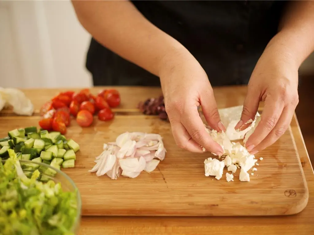 Coarsely chop Kalamata Olives (4 Tbsp). Add olives and Feta Cheese (2/3 cup) to large bowl with dressing. Halve the Cherry Tomato (1 cup), slice Shallots (2) in half then thinly across, add to bowl.