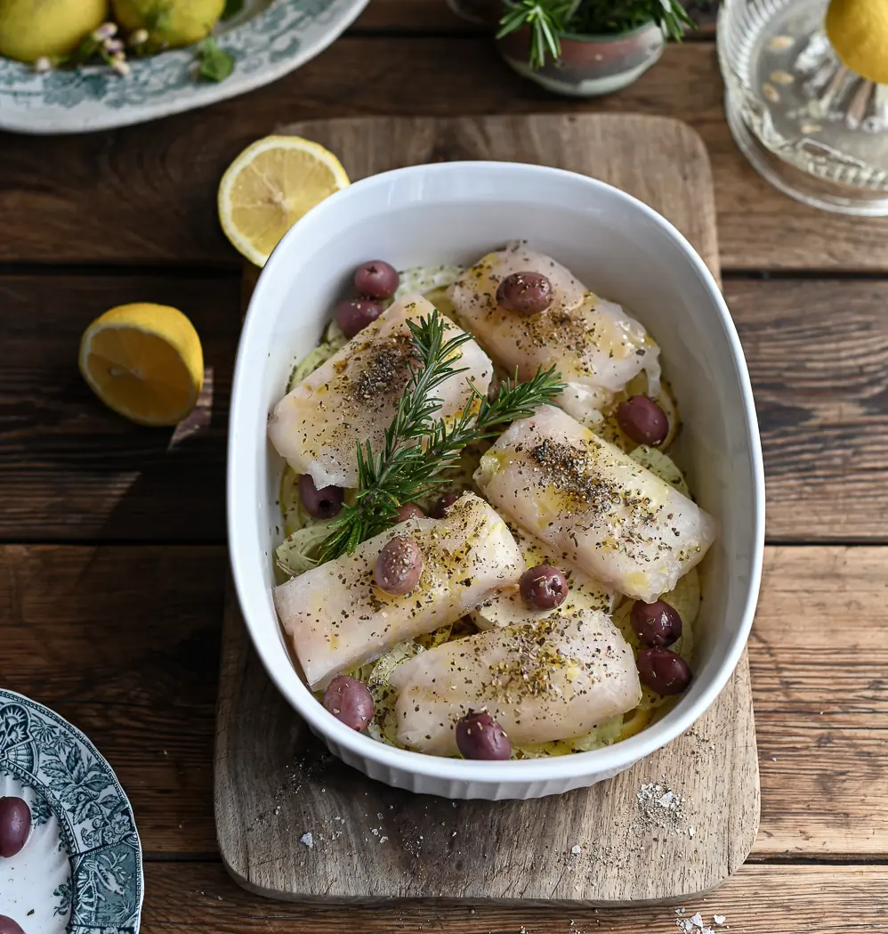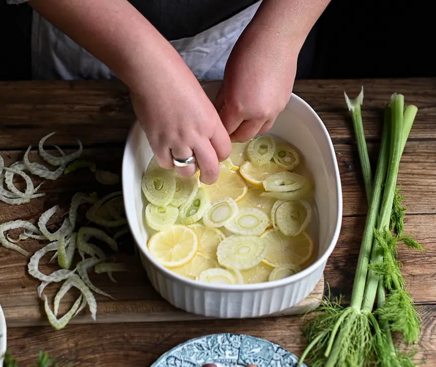 Drizzle a little Olive Oil (as needed) in the base of an ovenproof dish and layer over the fennel and lemon slices.