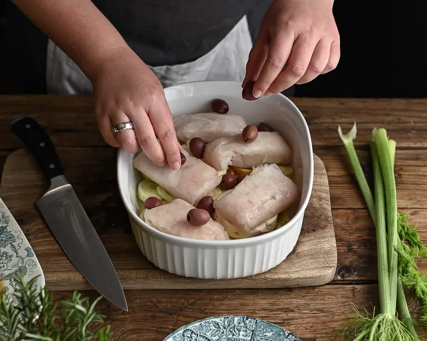 Add the Feta Cheese (as needed) and arrange the hake on top, scattering over the Black Olives (8).