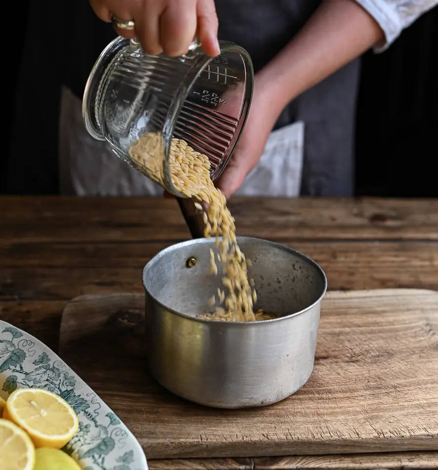 Cook the Orzo Pasta (1 1/2 cups) according to packet instructions and pour into a large bowl. Remove the hake from the dish and keep warm.