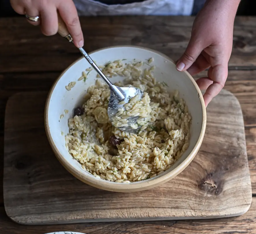 Using tongs, transfer the cooked fennel, feta, and olives from the ovenproof dish to the orzo and combine. Finely chop the reserved fennel leaves and add to the mixture.