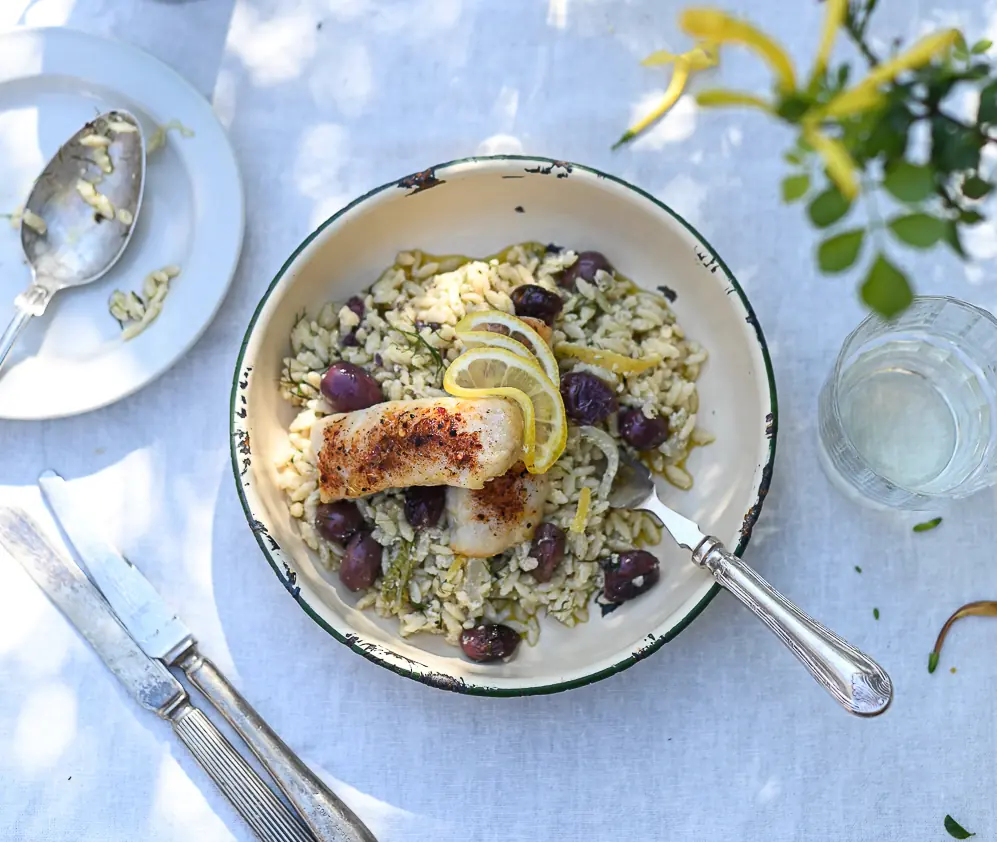 Spoon the orzo onto each plate and top with a Cape hake medallion. Serve with Lemon Wedge (1). Enjoy!