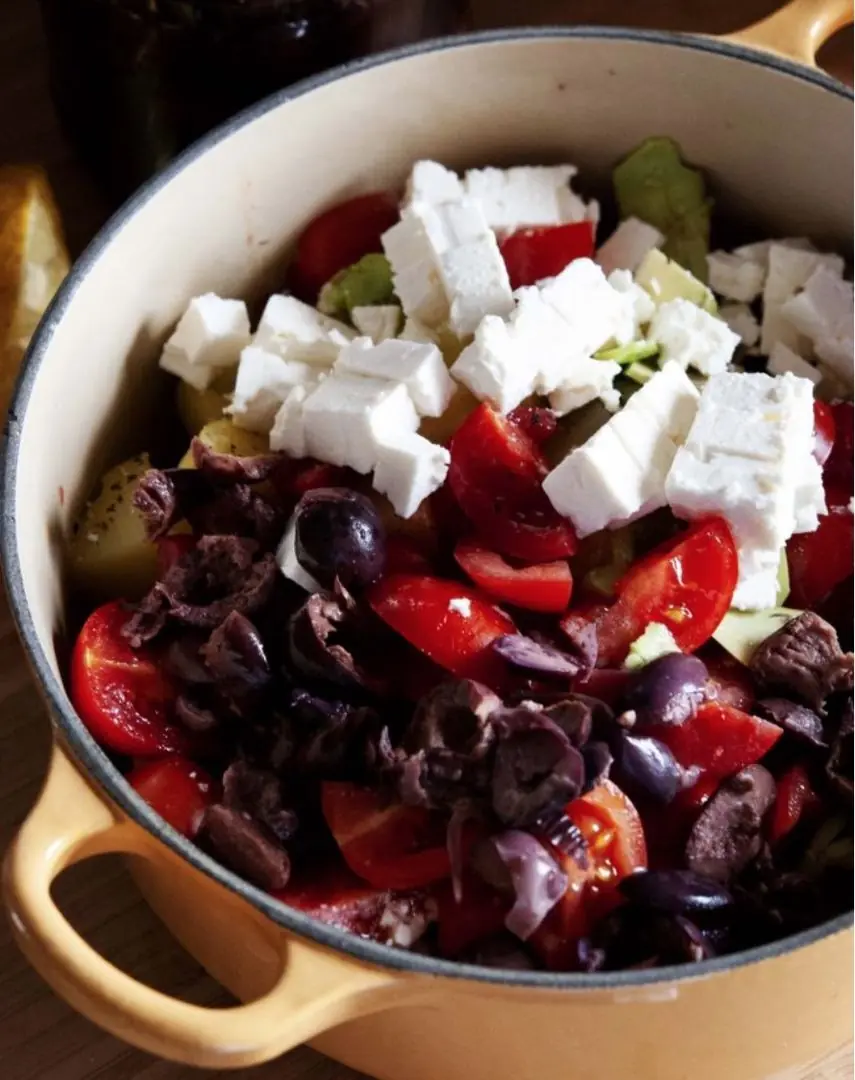 Into a large bowl, add Potatoes (4), Cherry Tomato (3/4 cup), Avocado (1/2), Kalamata Olives (1/3 cup), and Crumbled Feta Cheese (3/4 cup).