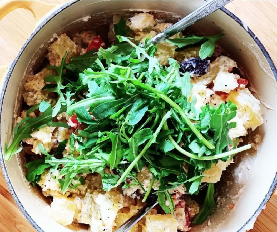 Add dressing to the salad along with Arugula (3 cups), and stir until all ingredients are combined.