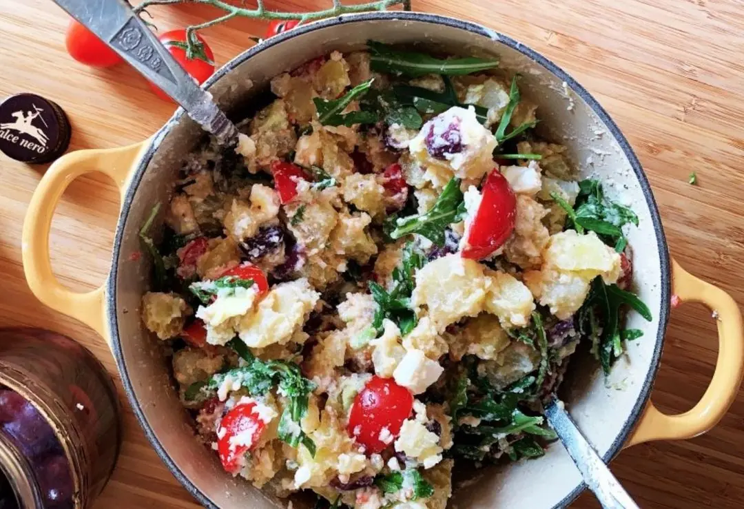 A refreshing potato salad that has all the classic Greek flavors: fresh herbs, feta, olives, a yummy yogurt dressing. This dish makes a great summer meal. You can make it ahead of time, in fact it stores well in the fridge for several days.