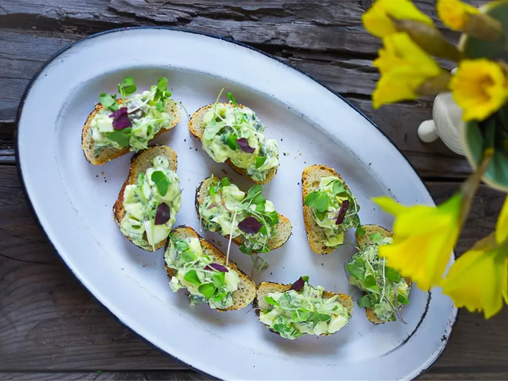 This Green Goddess Egg Salad recipe is great in a sandwich of course, but can also be served as a appetizer on bruschetta or even spooned onto endive. You can make a wrap with sprouts, or just pile a cup full over dressed greens with radish, tomato, sprouts or micro greens to boost nutrition.