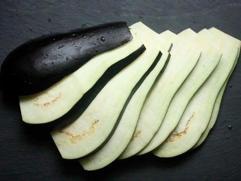 Remove the top and bottom of the Eggplant (1) and stand it up on a cutting board. Slice the eggplant length-wise as thinly as you can.
