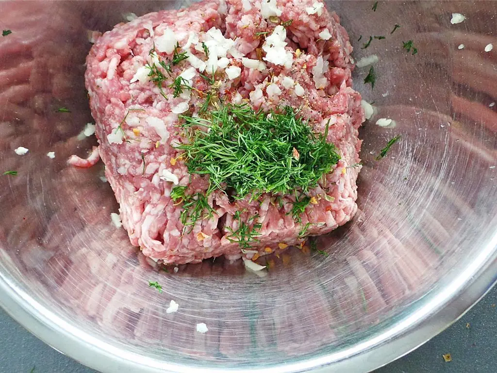 Add the Ground Lamb (1 lb), Fresh Dill (1 Tbsp), Mediterranean Spices (2 tsp), Crushed Red Pepper Flakes (1 pinch), Salt (to taste), and Ground Black Pepper (to taste) to a large bowl.