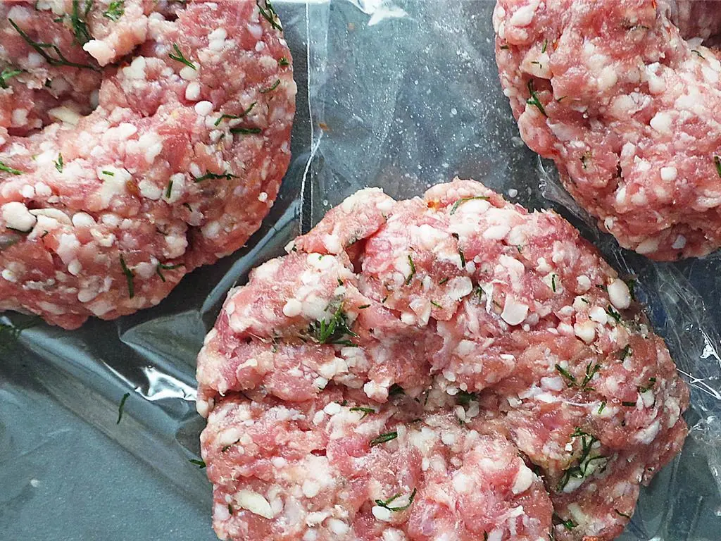 Scoop a fourth of the meat and form it into a burger. With your thumb, make an indent on the top of the patty. Transfer to a plate and repeat for the next three patties. Place the patties in the fridge for 30 minutes to one hour.