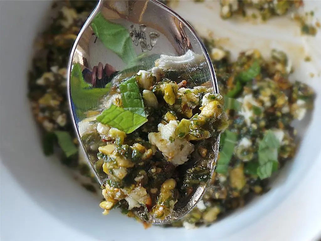For the pesto, combine the Fresh Mint Leaves (1 cup), Pistachios (4 Tbsp), and Olive Oil (4 Tbsp) in a food processor and pulse. Adjust olive oil as needed. Season with Salt (to taste). Fold in Feta Cheese (to taste).