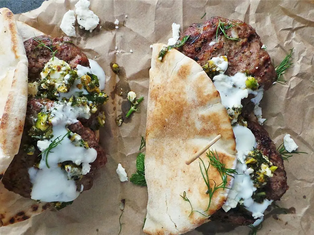Fire up the grill to a medium flame. Once hot, place the burgers down and cook 6-7 minutes on each side - only flipping once! Once cooked to desired doneness, transfer to a clean plate to rest. Add Pita Bread (4) to grill and heat until charred.