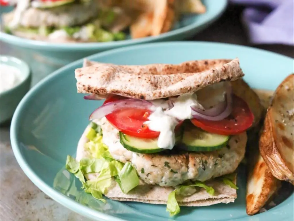 Time to build your burgers! Spread a dollop of yogurt sauce on the bottom half of each pita “bun.”