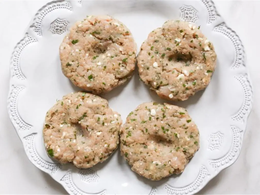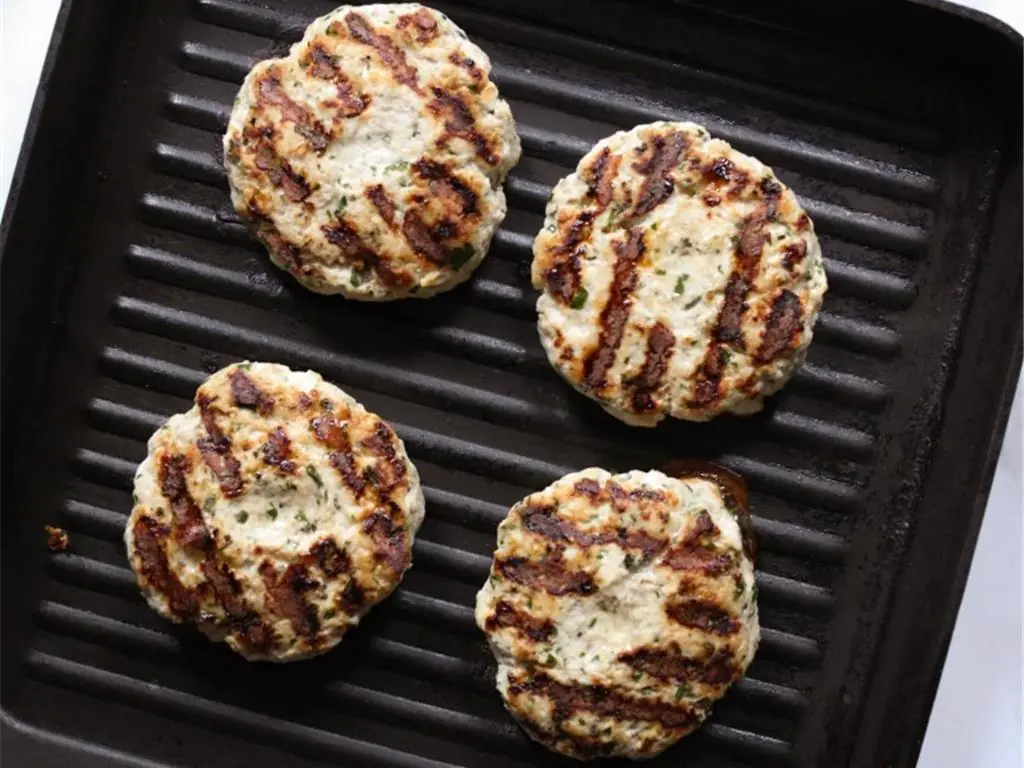 Gently form the turkey mixture into four patties, approximately ¾-inch thick. Using your thumb, make a small indent in the center of each patty.