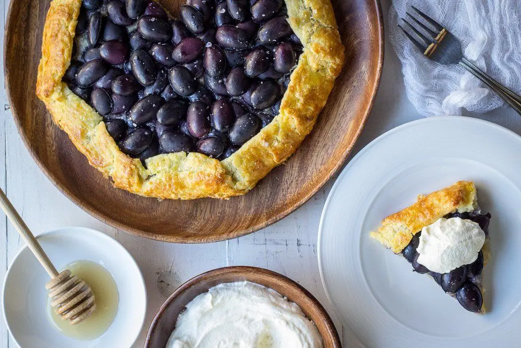 Wrapped up in a tender flaky pie crust, baked until golden, & finished off with a dollop of fresh Greek yogurt whipped cream on top- this halva and grape galette is a flavor revelation.