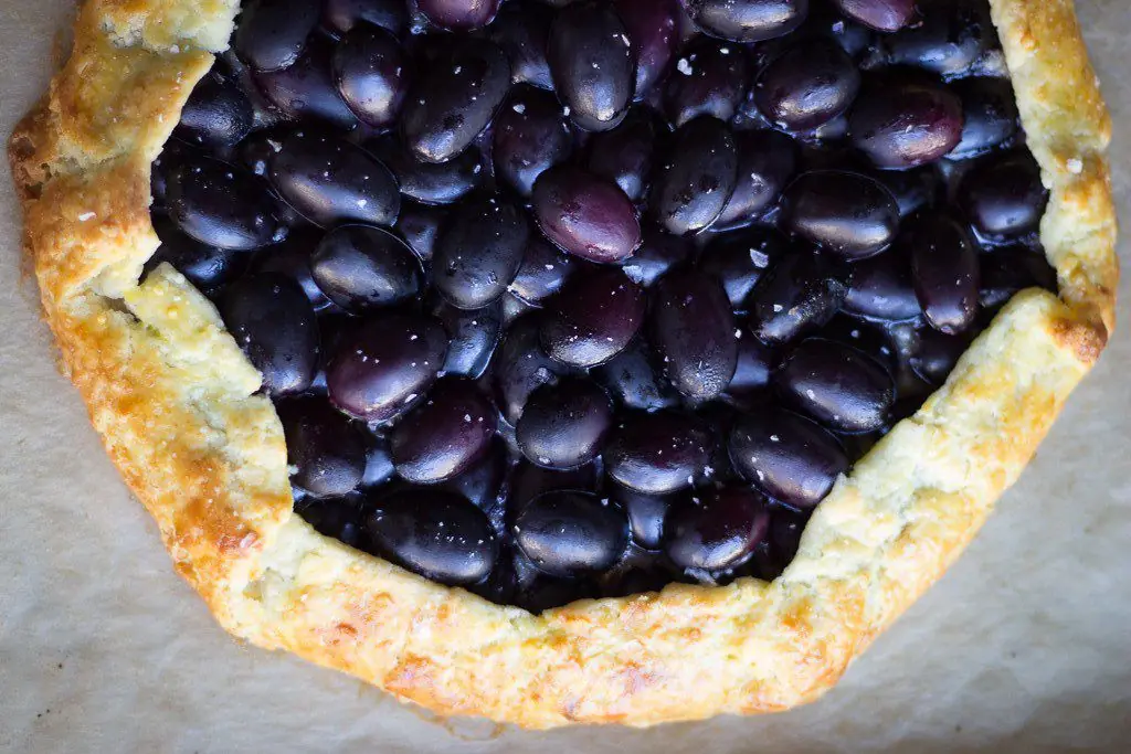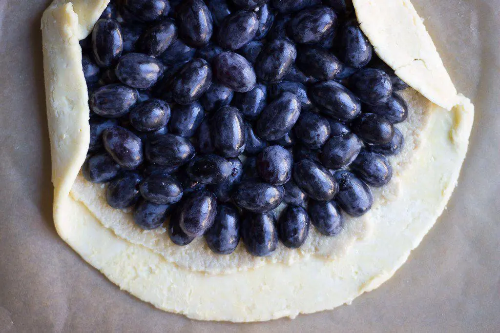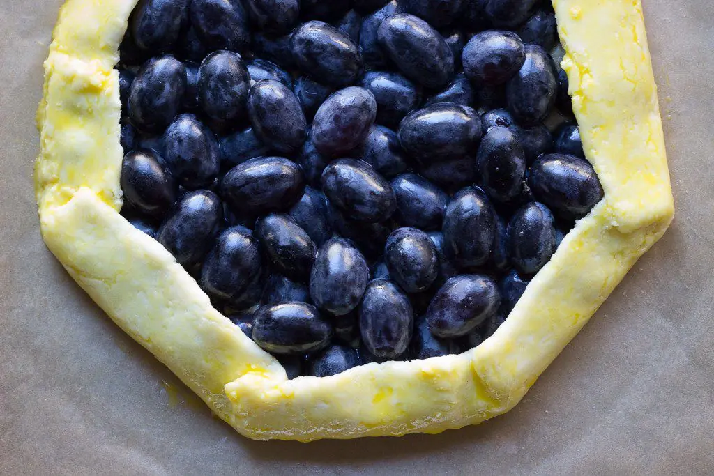 Gently use the parchment paper to fold up the edges of the crust around the grapes, one section at a time.