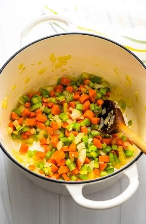 In a large pot or Dutch Oven, heat the Olive Oil (2 Tbsp) over medium-high heat. Add the Yellow Onion (1), Carrots (4), and Celery (3 stalks) and sauté until the vegetables are tender and the celery and onions are slightly translucent.