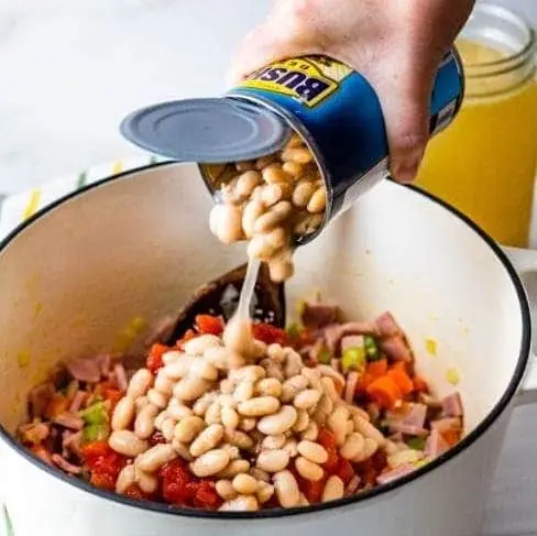 Add the diced Cooked Ham (2 cups), Diced Tomatoes (1 can), both cans of Great Northern Beans (2 cans), the Bay Leaf (1), Fresh Thyme (5 sprigs), and Chicken Stock (8 cups). Stir to combine and heat just to boiling. Add the rind of Parmigiano-Reggiano (to taste) if using.