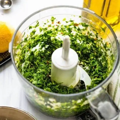 Roughly chop the Garlic (3 cloves) and transfer it to a mini prep food processor. Add the Fresh Basil Leaves (3 cups), Kosher Salt (1/2 tsp), Lemon (1/2 tsp), and Crushed Red Pepper Flakes (1/2 tsp). Pulse several times, scraping down the sides as necessary until the basil is finely chopped.