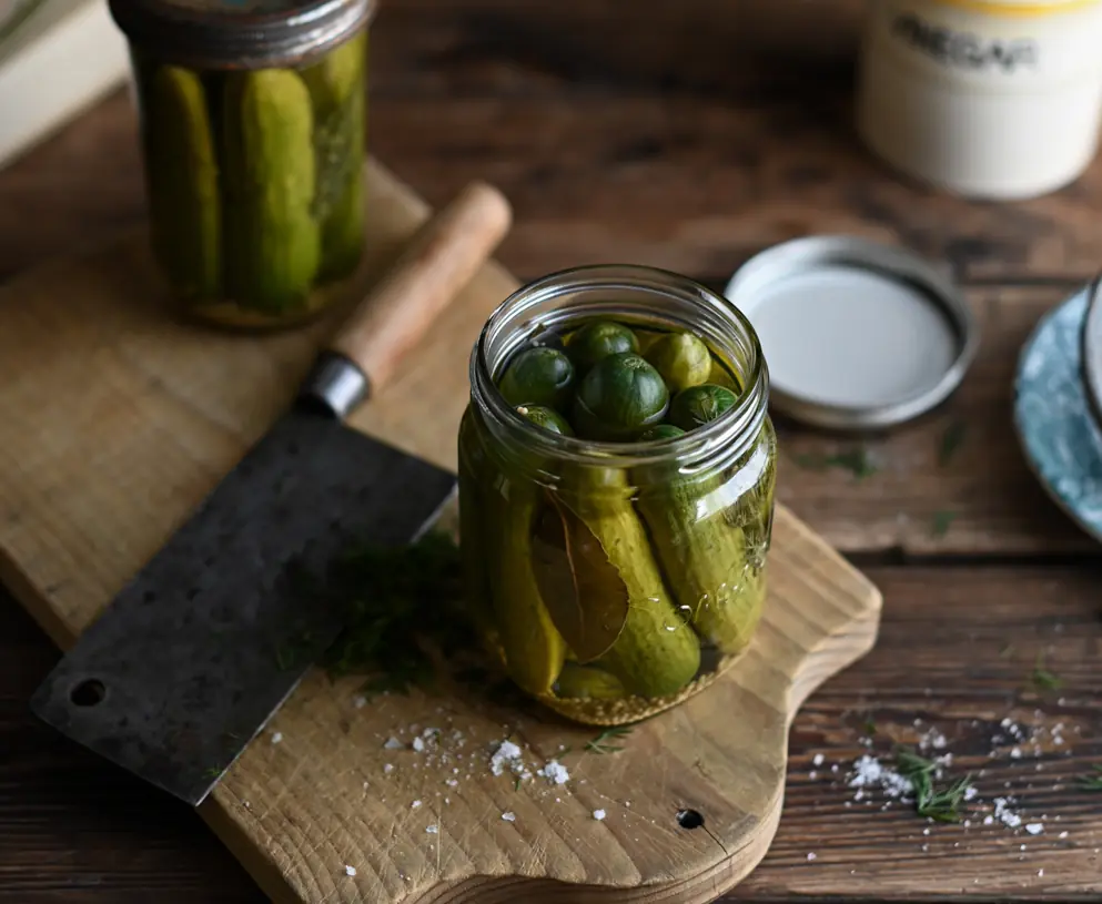 Pack the cucumbers tightly into a large, sterilized jar and pour over the brine, ensuring the cucumbers are completely covered. Tightly close the lid and leave the cucumbers to pickle for a week. Refrigerate after opening.