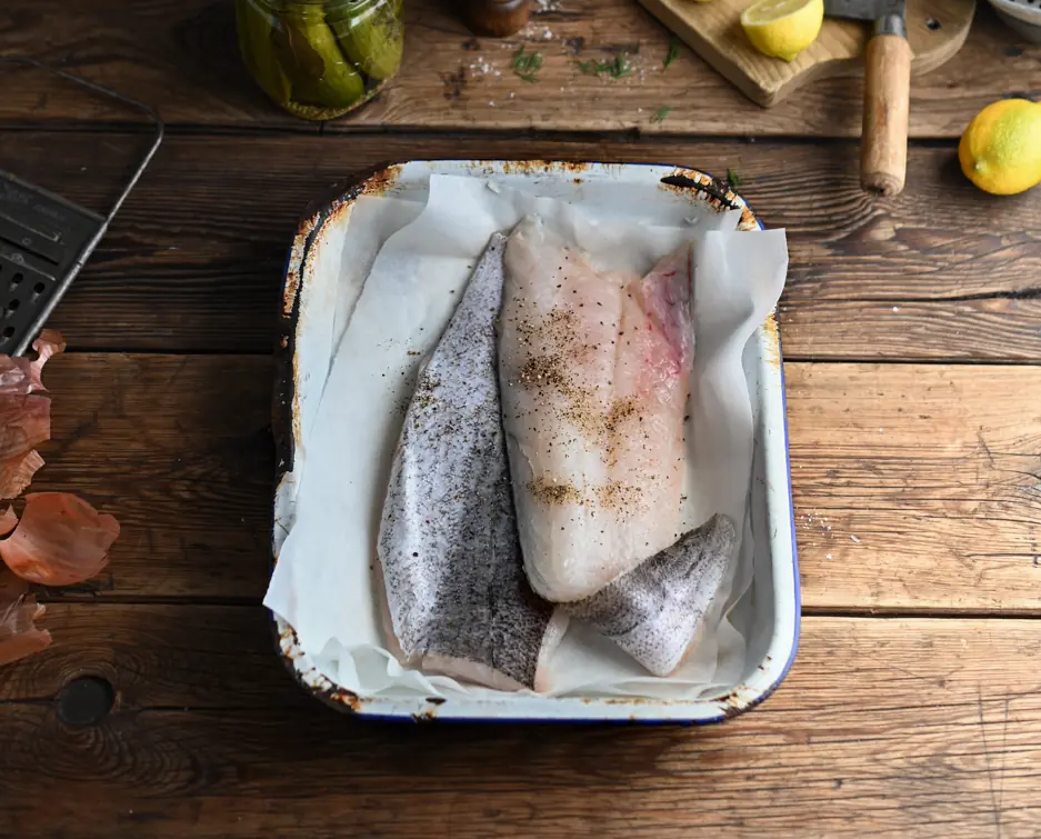 Slice the Skin-On Hake Fillets (1.3 lb) into sections and add to the food processor and blitz until combined. Season the mixture with Coarse Sea Salt (to taste) and Coarse Black Pepper (to taste).