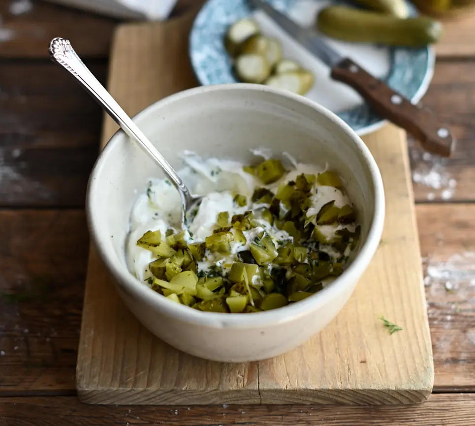 Finely chop two pickles and add them to the yogurt, along with 10 ml of the pickling brine. Season with salt to taste and keep chilled until needed.