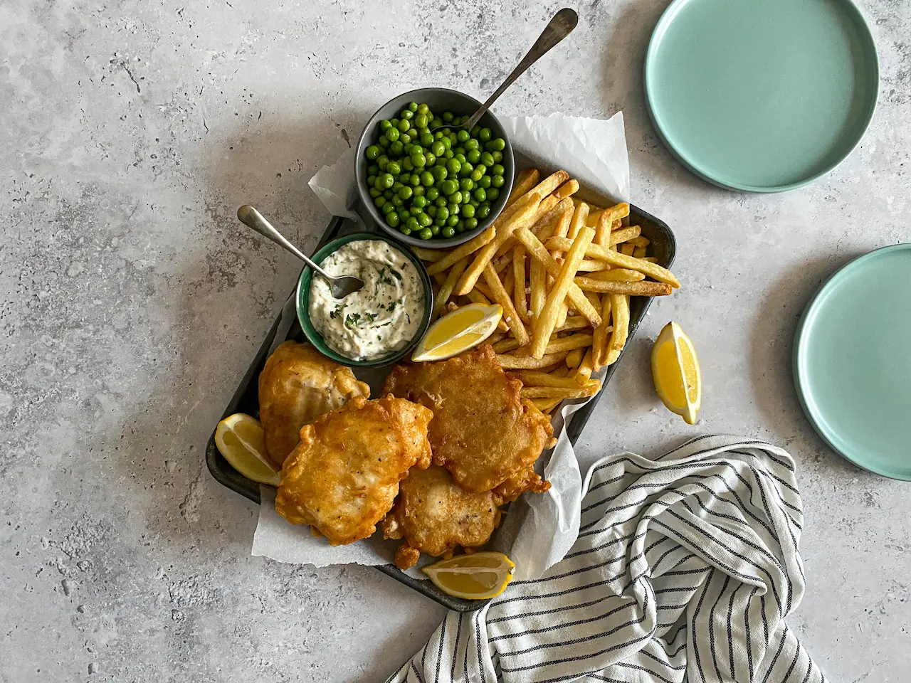 This perfect Homemade Beer Battered Cod is the perfect way to enjoy the seaside feel without having to leave home. This easy-to-follow recipe will allow you to create your very own crispy beer-battered cod, served with oven fries, sweet peas, and tartar sauce.