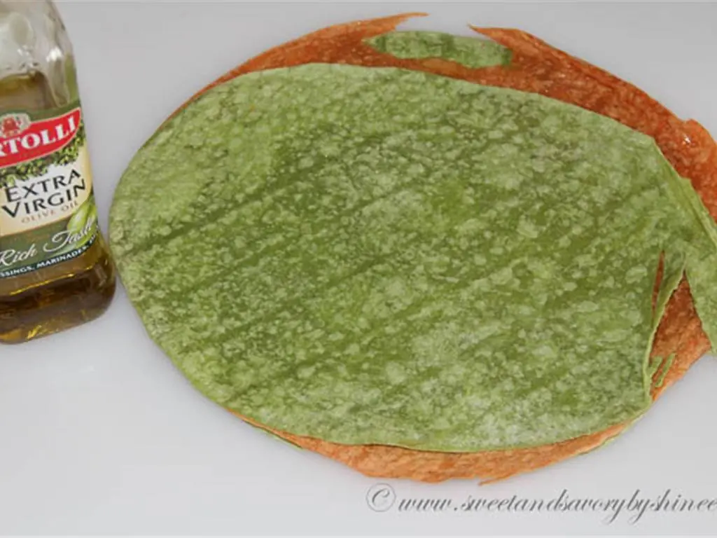 Evenly spread a tablespoon of Olive Oil (4 Tbsp) over each Flour Tortillas (4). Stack the wraps on top of each other. This will oil both sides of the wrap.