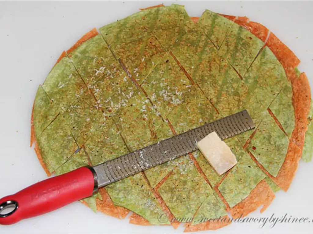 Using a pizza cutter cut the wraps in to small bite sizes. Grate some Parmesan Cheese (to taste) over the wraps.