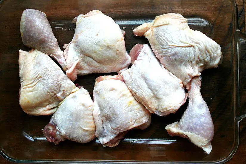 Place Bone-In, Skin-On Chicken Legs (2 lb) in a greased (I always forget) shallow baking pan skin-side up.