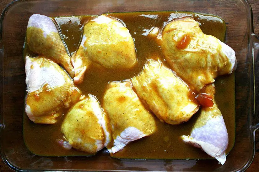 Pour over the chicken then toss with a spatula (or your hands) so that the pieces are nicely coated and so the sauce fills the underside of the chicken.