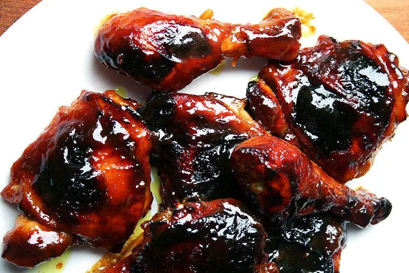 Bake for 1 hour and 15 minutes to 1 hour and 30 minutes. Baste until after the hour mark, then let it caramelize. Also, keep an eye on it — the sauce chars quickly especially at the end.