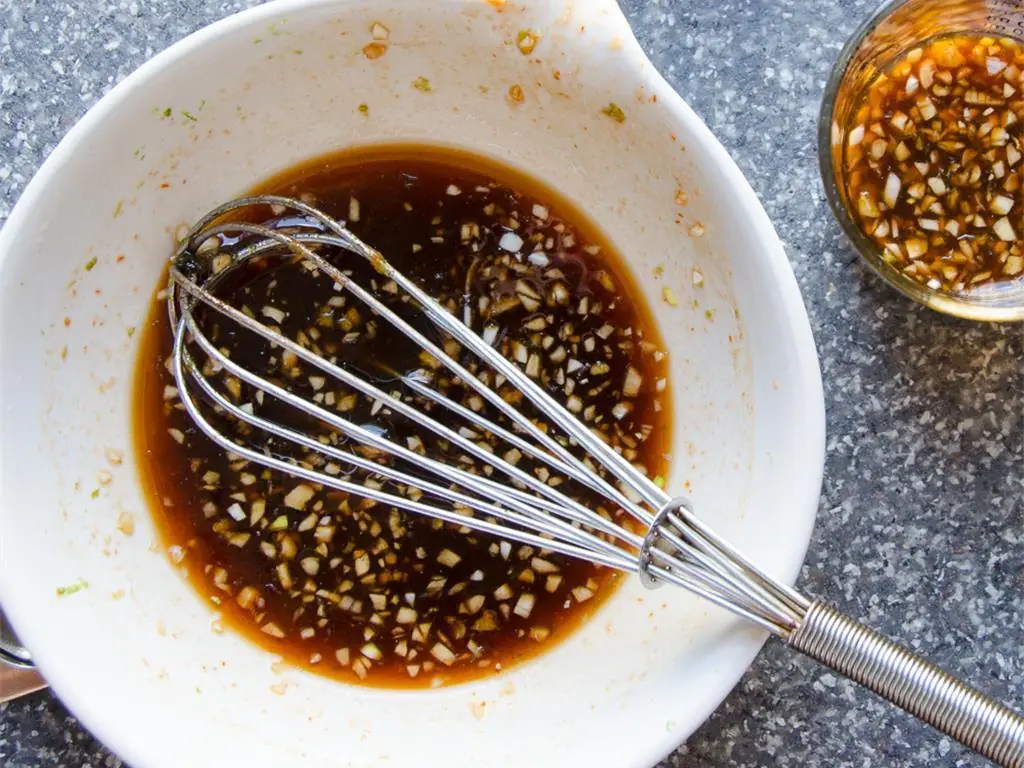 Assemble the sauce. In a small bowl, combine the Garlic (2 Tbsp), Sriracha (2 Tbsp), Fish Sauce (2 tsp), Honey (1/2 cup), Soy Sauce (2 Tbsp), and Limes (2). Stir to combine. Reserve 1/4 cup for dipping.