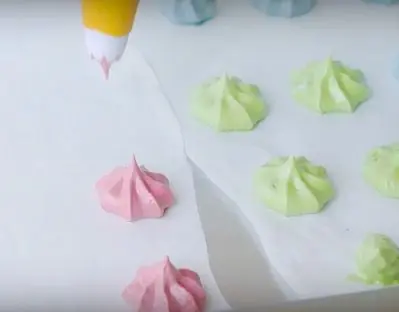 Pipe meringue kisses onto a baking sheet lined with parchment paper with a star-fitted tip. They should be slightly smaller in circumference than your macaron shells.