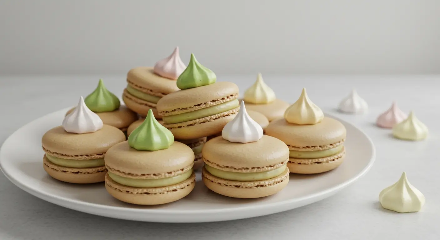 To assemble, fill the macarons with your desired filling. Use Chocolate (to taste) as glue to attach the meringue kisses to the macarons. Serve and enjoy!