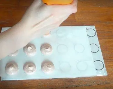 Transfer the batter to a piping bag with a round tip and pipe out macarons. After piping, knock the bottom of the tray against a flat surface to get rid of air bubbles.