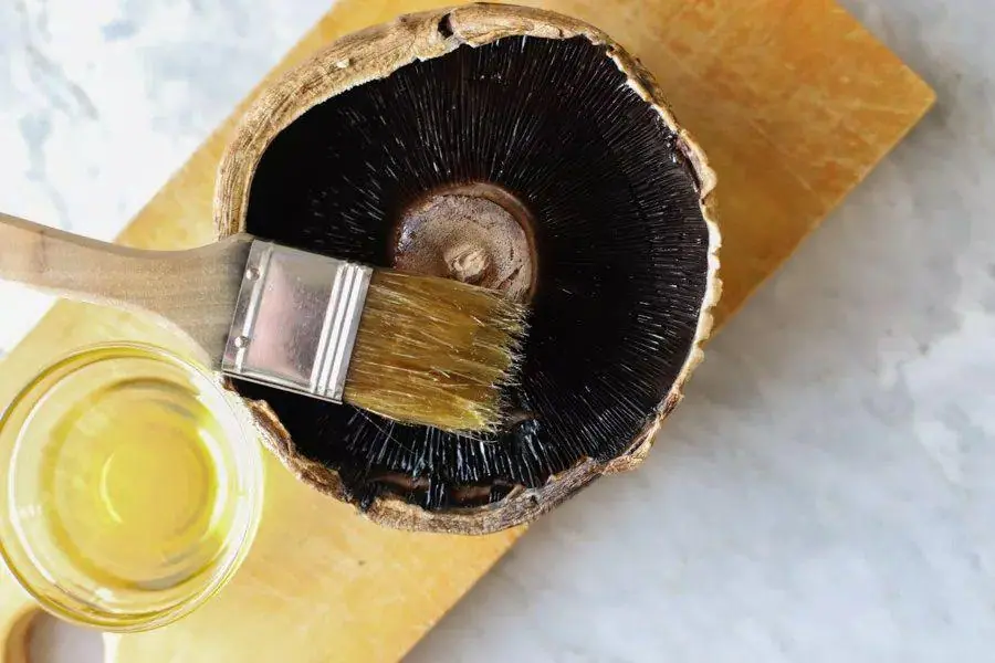Prepare the Portabella Mushroom Caps (4) by cutting off protruding stems. This will help keep a cavity for the topping. Brush caps with Extra-Virgin Olive Oil (as needed). Bake for 25 minutes.