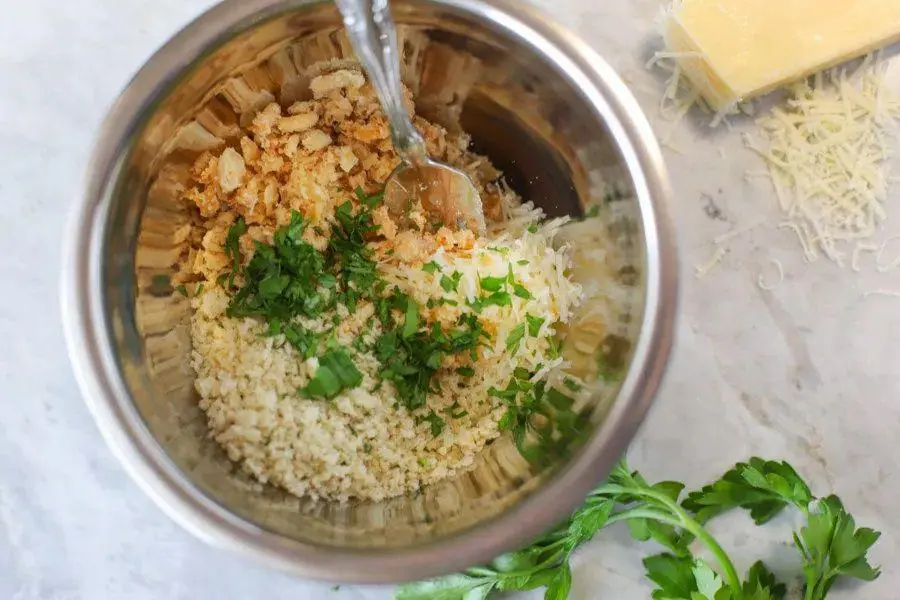 Meanwhile, prepare the crust topping. In a small bowl, measure out Fried Onions (2/3 cup) and crush into fine pieces with a fork. Add Seasoned Panko Breadcrumbs (2/3 cup), Parmesan Cheese (4 Tbsp), and Fresh Parsley (1 tsp) to bowl and mix until combined. Set aside.