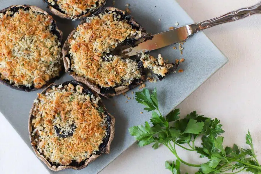 After baking for 25 minutes, remove the mushrooms and top generously with the topping mixture. Put mushrooms back in oven to bake for an additional 5 minutes.