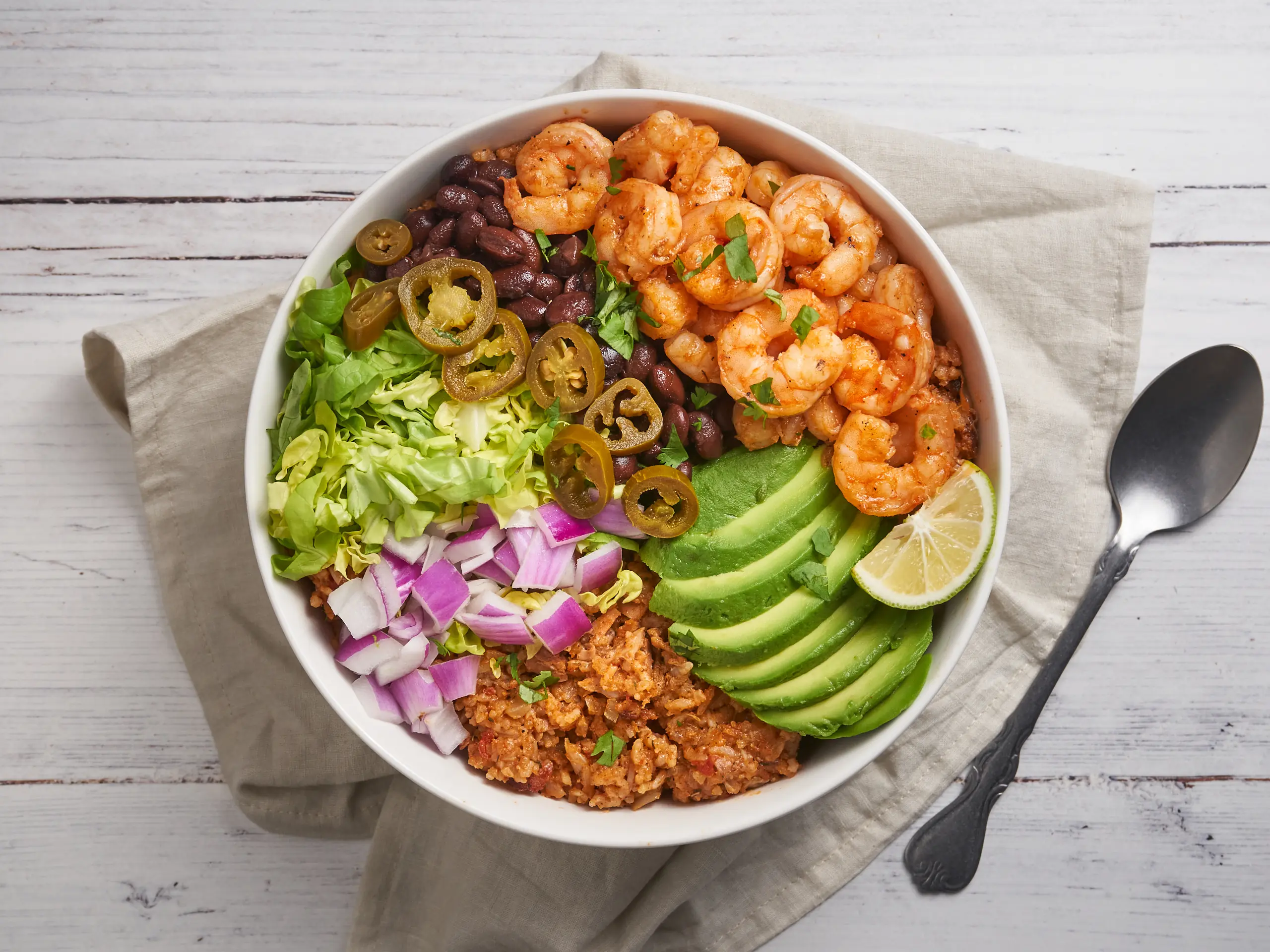 Taco Tuesday just got a whole lot tastier! Our recipe combines jambalaya shrimp in a savory tomato broth with all the classic taco toppings. Add in some brown rice, lettuce, tomatoes, cheese, jalapeños, and more - it's an unbeatable flavor combo! These beautiful bowls are perfect for lunch or dinner - or better yet, why not make them ahead for meal prep?
