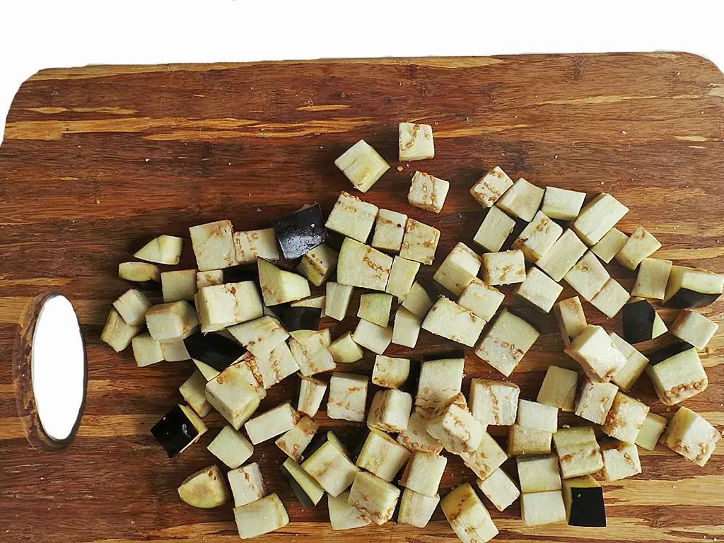 Rinse and pat the eggplant dry. Cut into cubes and give a good sprinkle of Olive Oil (as needed) and slide in the oven for 20 minutes, flipping around halfway through. They'll be tender and smell yum.